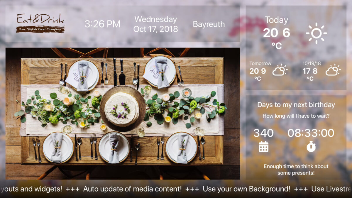 Use predefined stylish layouts with date, clock and weather information, change the background to your business needs.